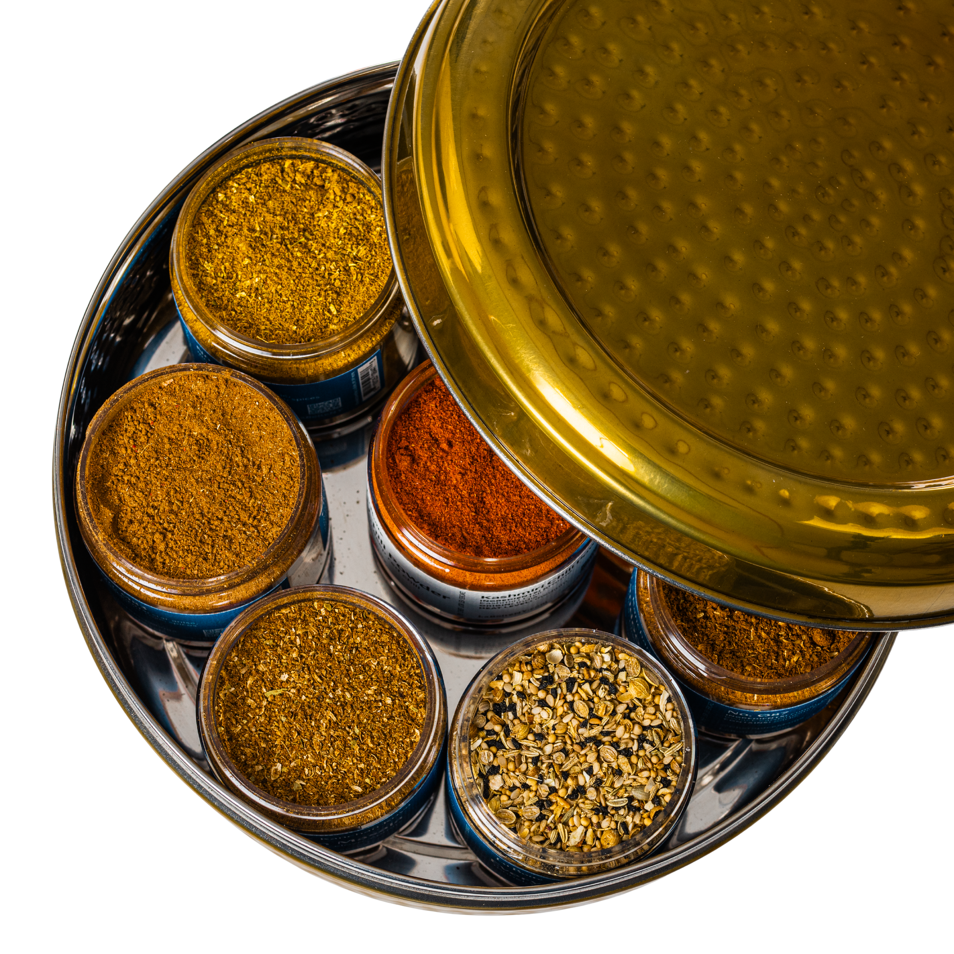 8 jars of spices in a classic dabba tin to keep at arm’s length for spooning, sprinkling, and stirring.